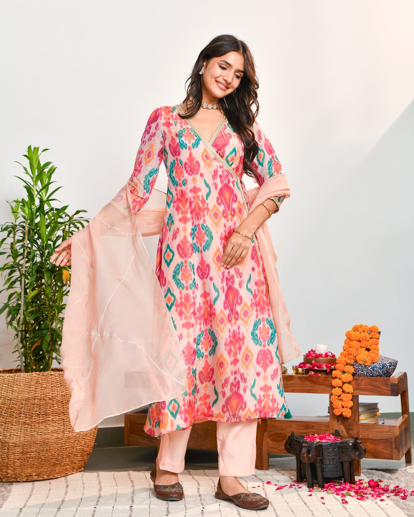 Crafted in a breezy Anarkali silhouette with three-quarter sleeves, this kurta blooms in a vibrant red floral print. Paired with elasticated printed trousers and a sheer organza dupatta, it makes the perfect ensemble for summer outings and casual celebrations.