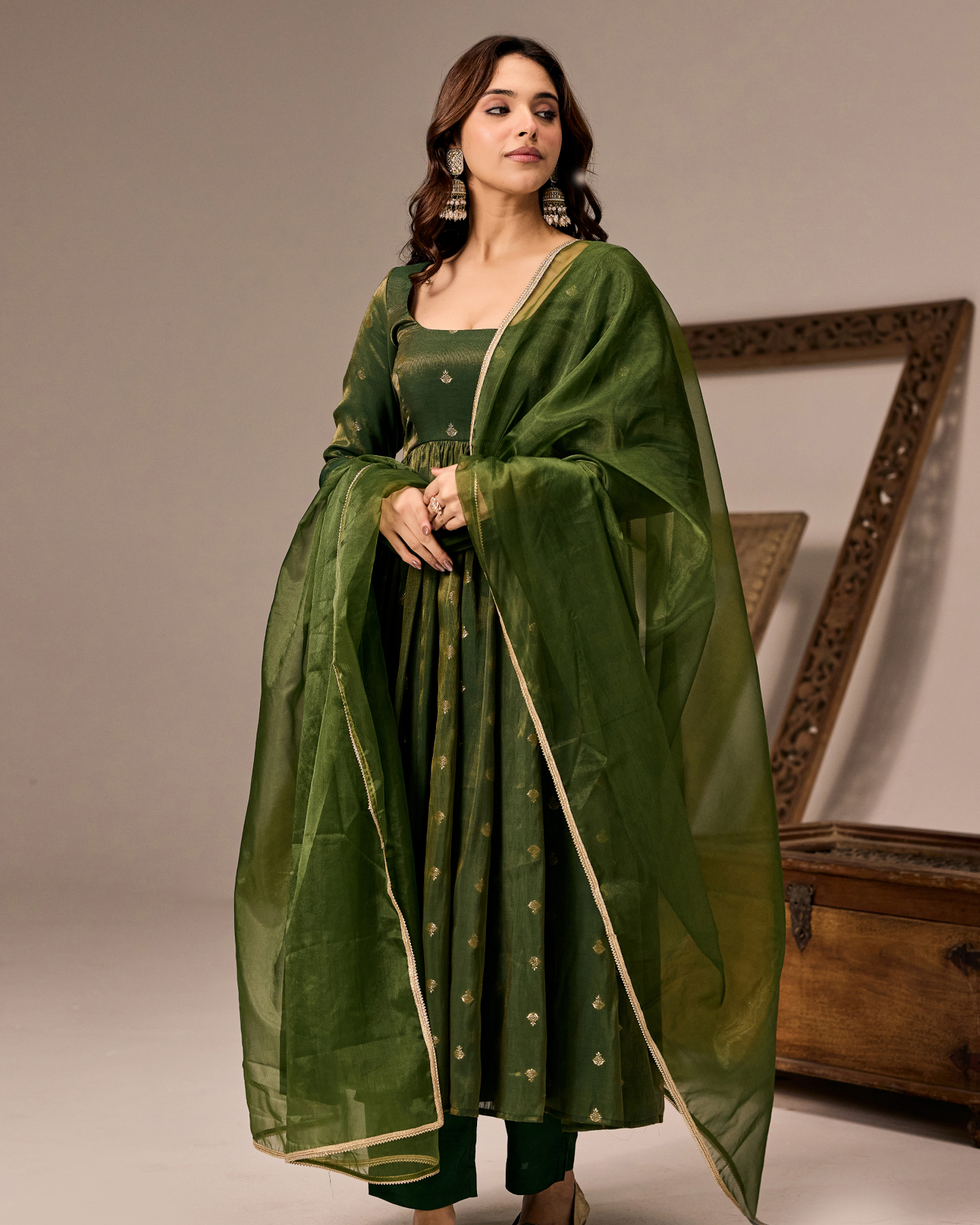 "A regal pick in deep green, this Anarkali suit is adorned with golden boota work, full sleeves, and a classic round neckline. Comes with matching pants and a flowy organza dupatta to complete the festive-ready look.