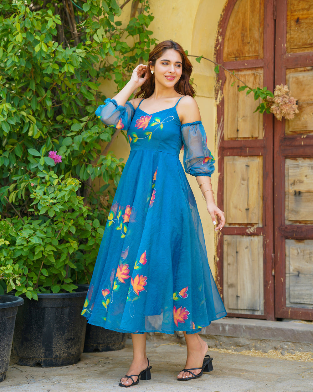 Step into the spotlight with our Teal Blue Handpainted Floral Maxi Dress. This dress features a round neckline and full sleeves, combining elegance with comfort. The straight pattern offers a flattering fit, making it ideal for festive occasions. Crafted from rayon slub, this dress is soft and breathable. The ikat prints add a touch of cultural heritage, ensuring you stand out at any event. Pair it with your favorite accessories to complete the festive look.