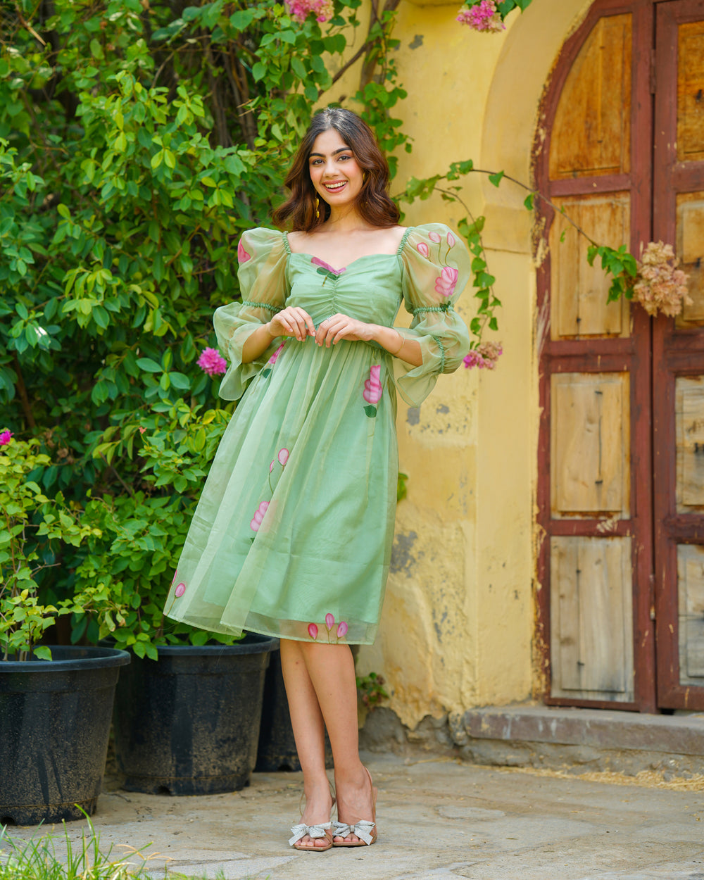 Embrace the delicate beauty of our Handpainted Organza Pista Dress. This dress features a sweetheart neckline and puff sleeves, adding a touch of romance to your casual wardrobe. The gathered pattern enhances its airy and elegant silhouette. Crafted from lightweight organza, this dress promises comfort and sophistication. The handpainted floral prints bring an artistic touch, ensuring you stand out in any crowd. Perfect for casual outings, this dress will keep you looking and feeling beautiful all day long.