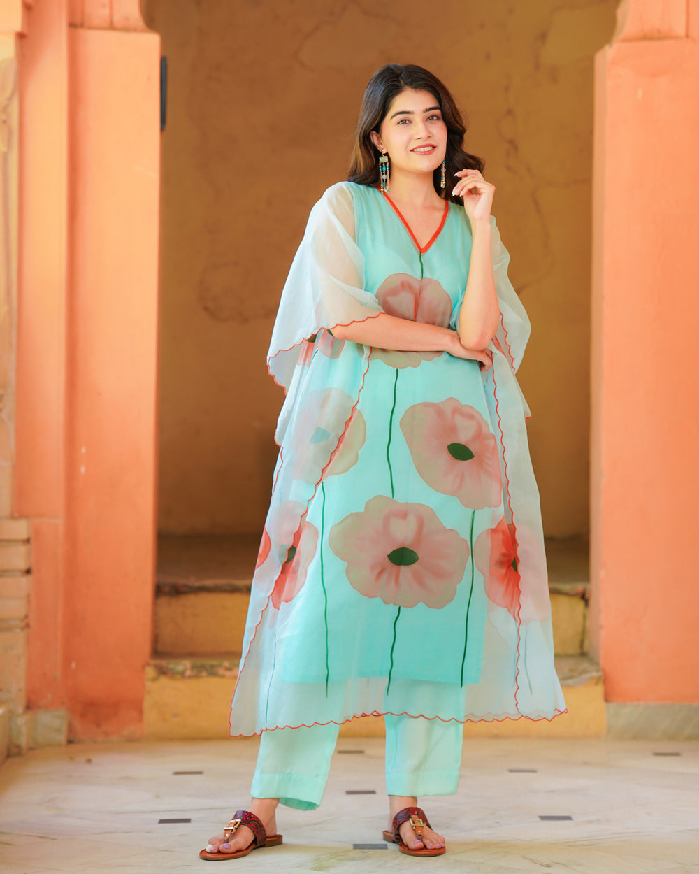 Transform your look with our blue summer suit set, perfect for any occasion, from casual outings to festive events. Our 2-piece set includes a vneck kaftan kurta, straight pants bottoms.
