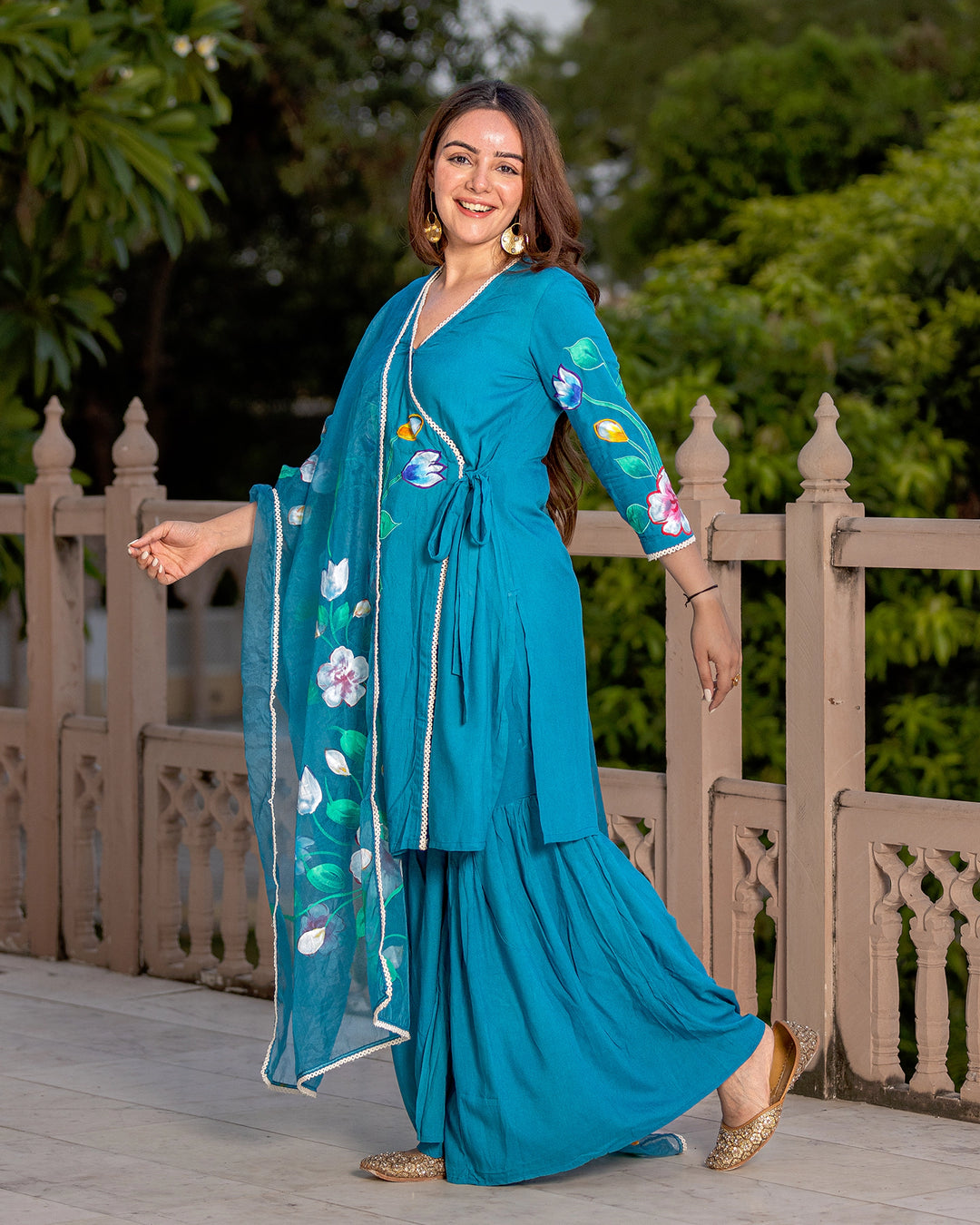 Teal Handpainted Floral Sharara set