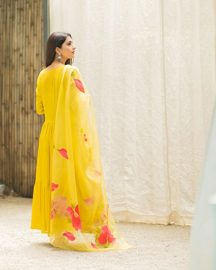With its gathered semi-sheer georgette full sleeve jacket over cotton straight slacks and a cotton strappy bustier for a daily finishing touch, our Yellow Cape Handpainted Suit Set is one to give you a joyful summer. Combined with a Handpainted Organza Dupatta, it transforms into a standout costume for any occasion.