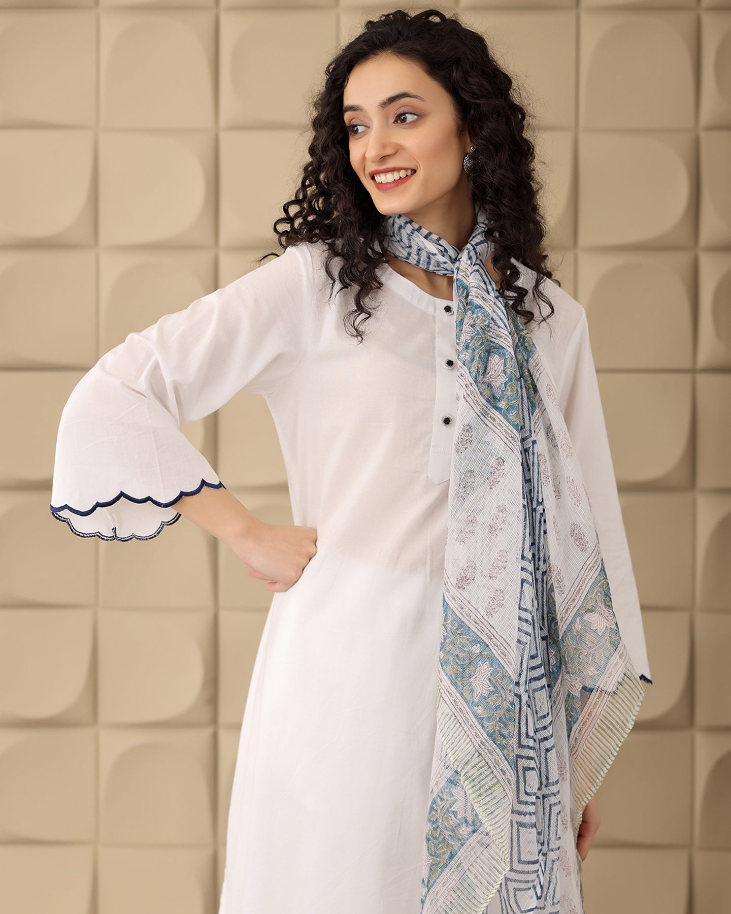 This white cotton A-line kurta set features scallop hem, paired with a striking blue geometric print dupatta, adding a modern touch to the traditional design. The breathable cotton fabric ensures comfort throughout the day.
