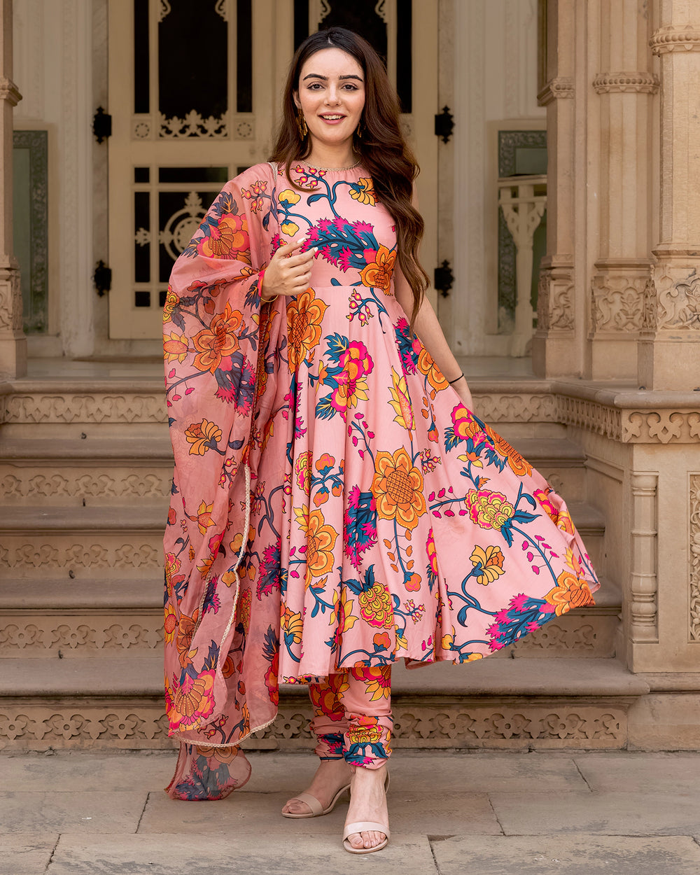 Embrace elegance in our pink muslin Anarkali suit set. Crafted with finesse, our 3-piece ensemble features a halter neck Anarkali kurta depicting charming floral print tale in a contrasting tone, a pair of churidaar pants, and a stunning ornated dupatta. This contemporary fit is ideal for day festivities.