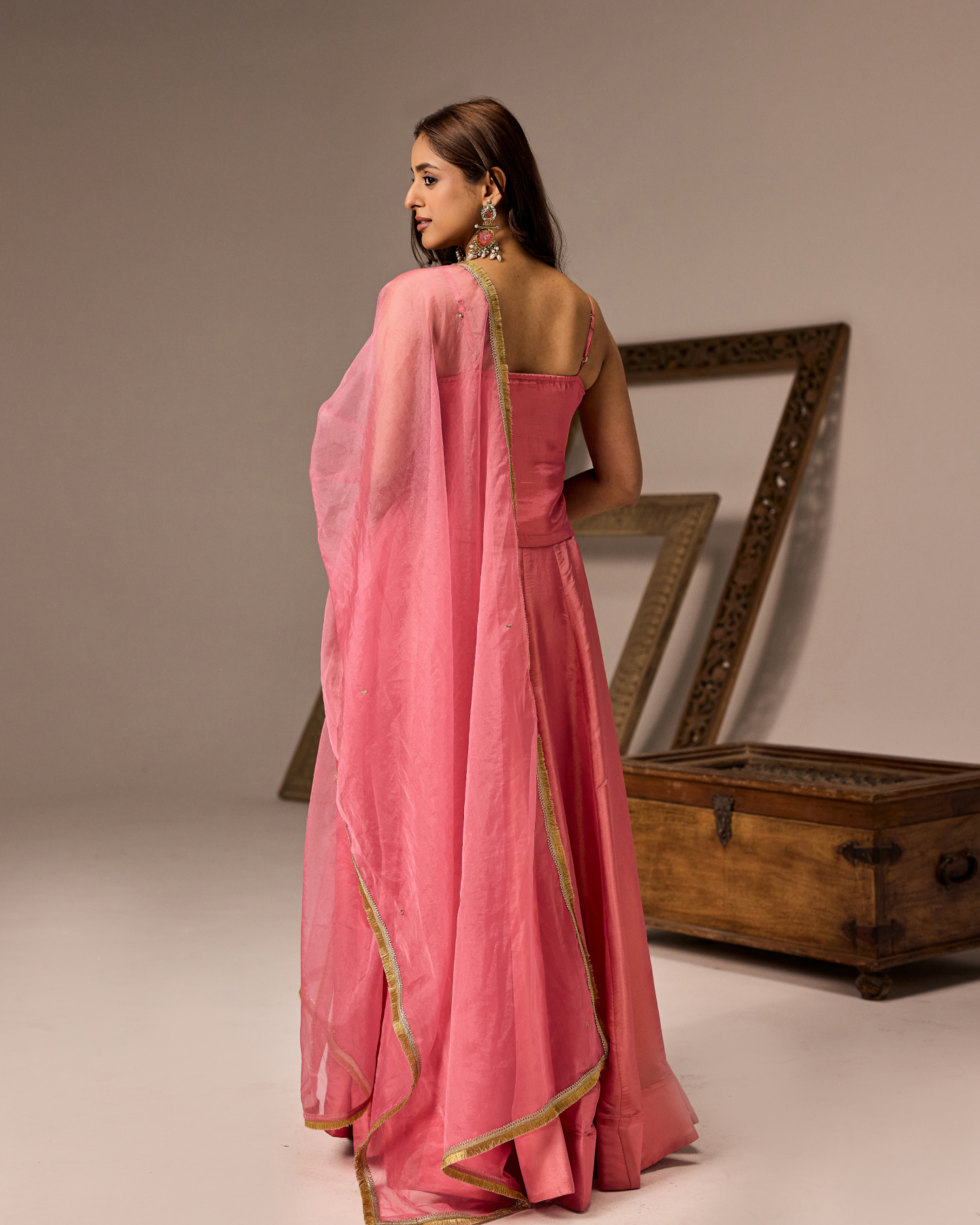 "Soft and elegant, this powder pink lehenga set includes a strappy blouse, a flowy lehenga skirt, and a sheer dupatta finished with delicate borders. Light, graceful, and feminine.