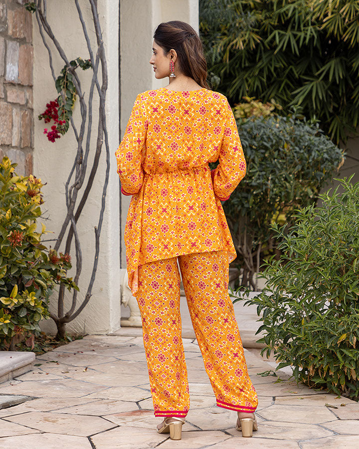 Billy coord set consists of a printed top and pants in muslin with drawstring and tassels on front to enhance the look. a perfect co-ord for summer parties. pair it with heels to rock it.