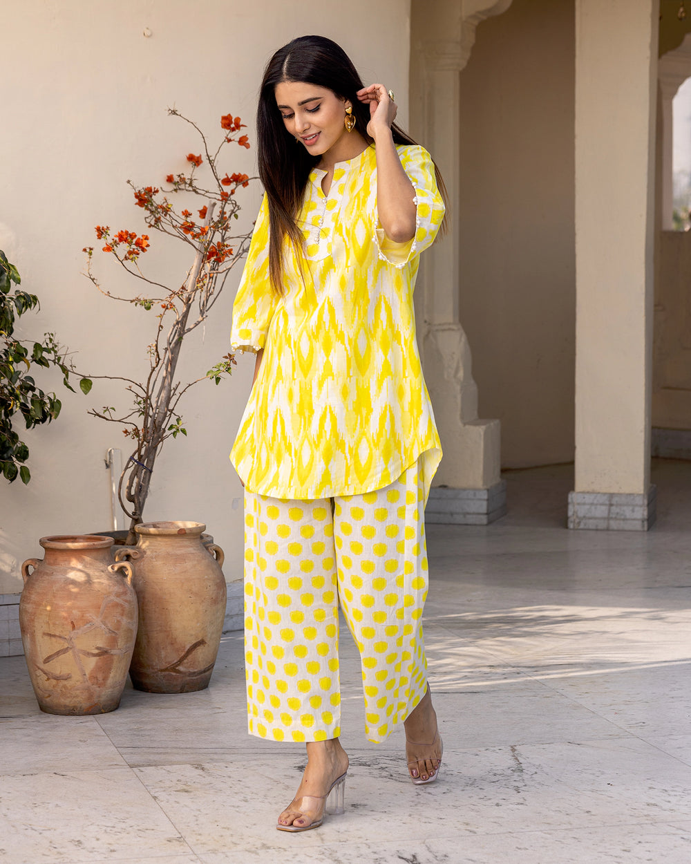 Serve a suave and oomph-worthy appeal in our breezy summer ensemble, accentuated with contemporary aesthetics and washed in a dopamine-inducing palette of lemon yellow. Our 2-piece trendy co-ord set is crafted in a plush weave of cotton and includes a round neck straight-fit top beaded with a contrasting Ikat print tale, and a pair of straight-fit bottoms.