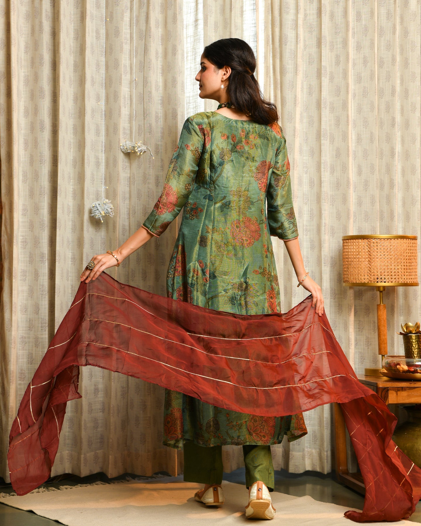 • Calming sage green color combined with a lightweight tissue fabric for fresh festive style
