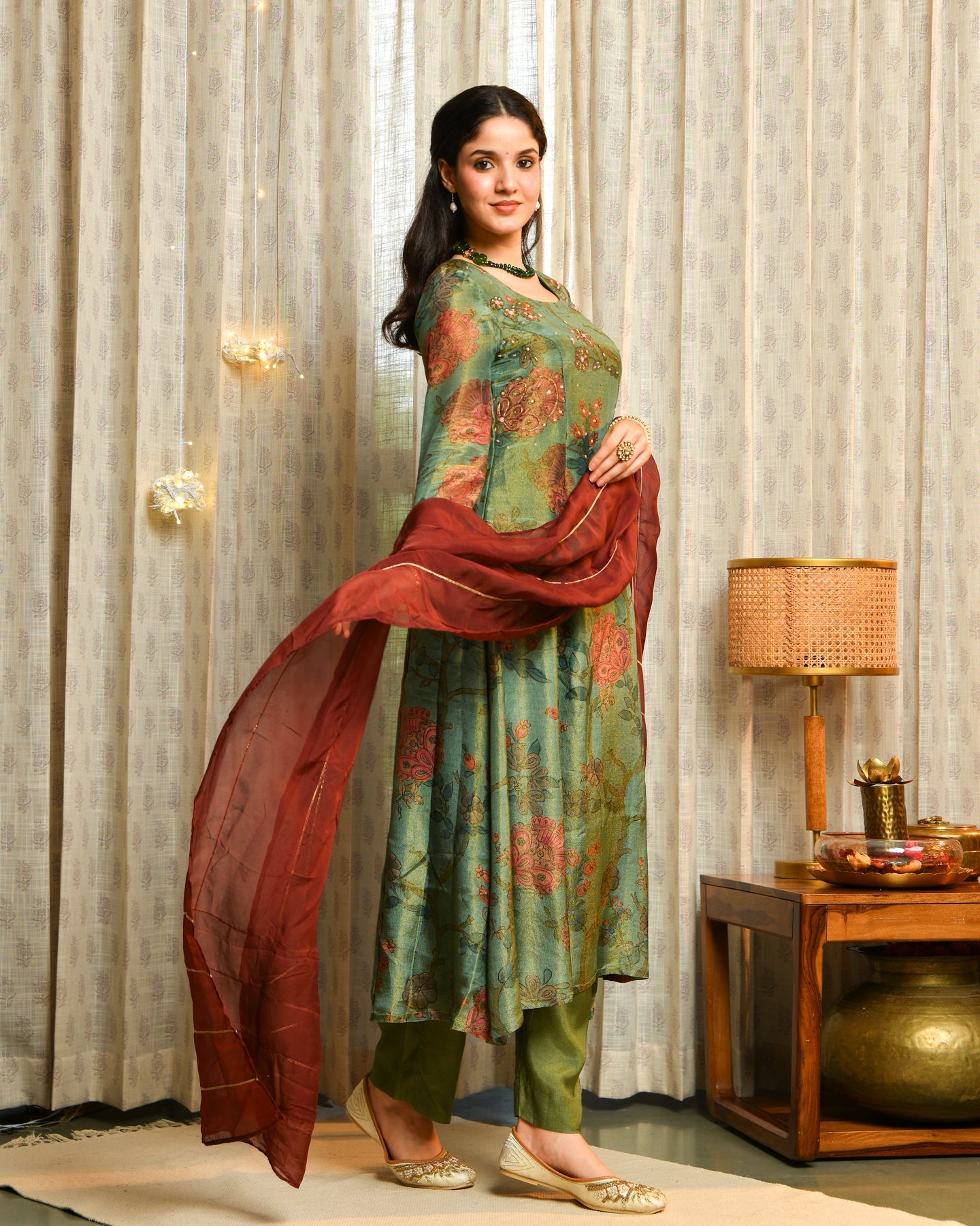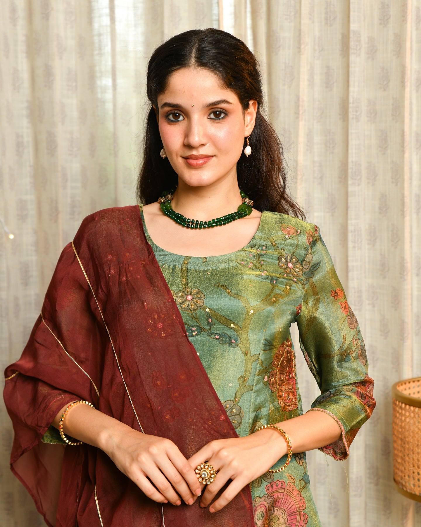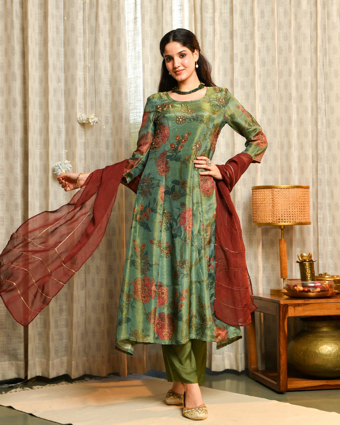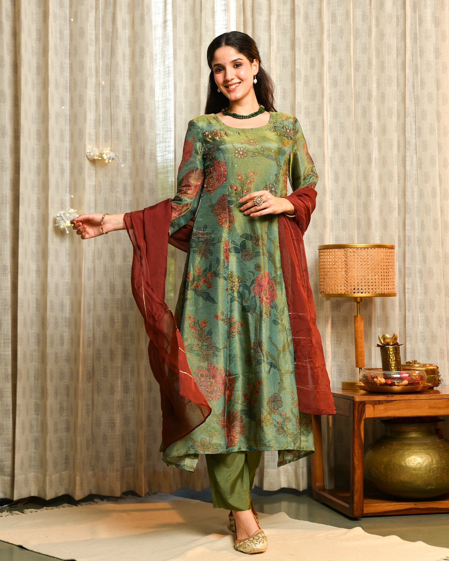 Elevate your festive wardrobe with the sophisticated Sage Green Tissue Suit Set, perfect for special occasions and elegant celebrations. Made from a breathable blend of 94% viscose and 6% nylon, the A-line kurta features a soothing sage green tone with a delicate tissue texture. The kurta boasts a flattering round neckline and regular sleeves, while the matching dupatta and bottomware complete the ensemble with a graceful silhouette and comfortable fit. Finished with a machine weave for lasting quality, this suit set offers a fresh and modern ethnic style that's easy to wear.