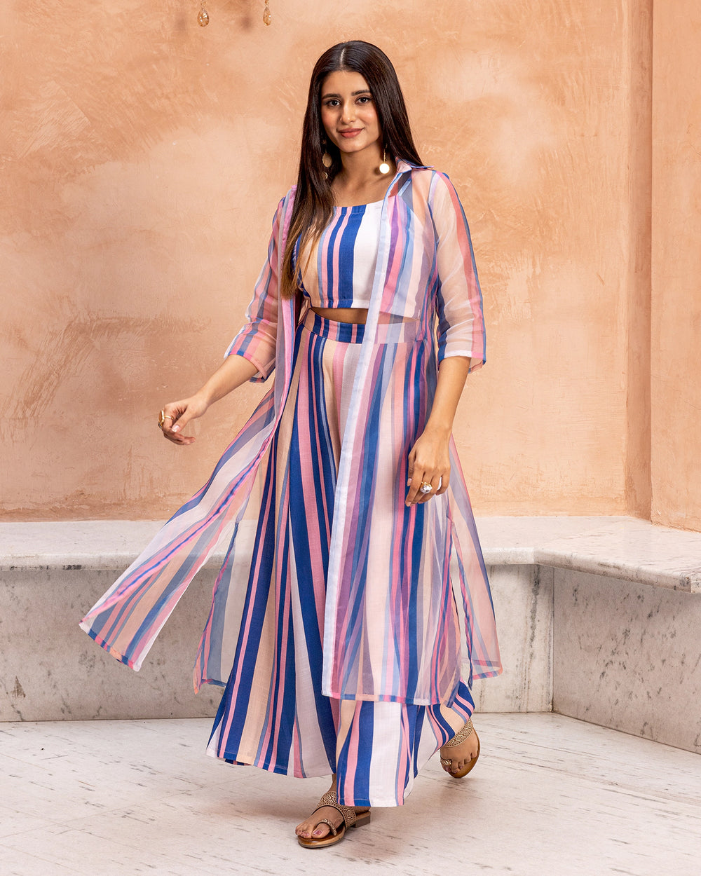 Serve a suave and oomph-worthy appeal in our breezy summer ensemble, accentuated with contemporary aesthetics and washed in a dopamine-inducing multicolour palette. Our 3-piece trendy co-ord set is crafted in a plush weave of rayon and includes a collared neck straight-fit overlay, a strappy crop top, and a pair of flared palazzos beaded with a contrasting stripes print tale.