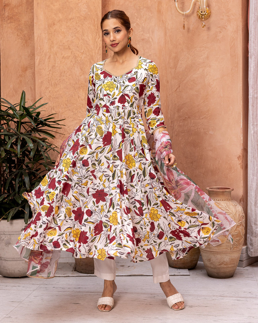 Serve a suave and oomph-worthy appeal in our breezy summer ensemble, accentuated with contemporary aesthetics and washed in a soothing palette of off-white. Our 3-piece assorted suit set is crafted in a premium weave of muslin and includes queen neck kalidaar kurta beaded with animated floral print tale, a pair of straight-fit bottoms, and a dupatta.