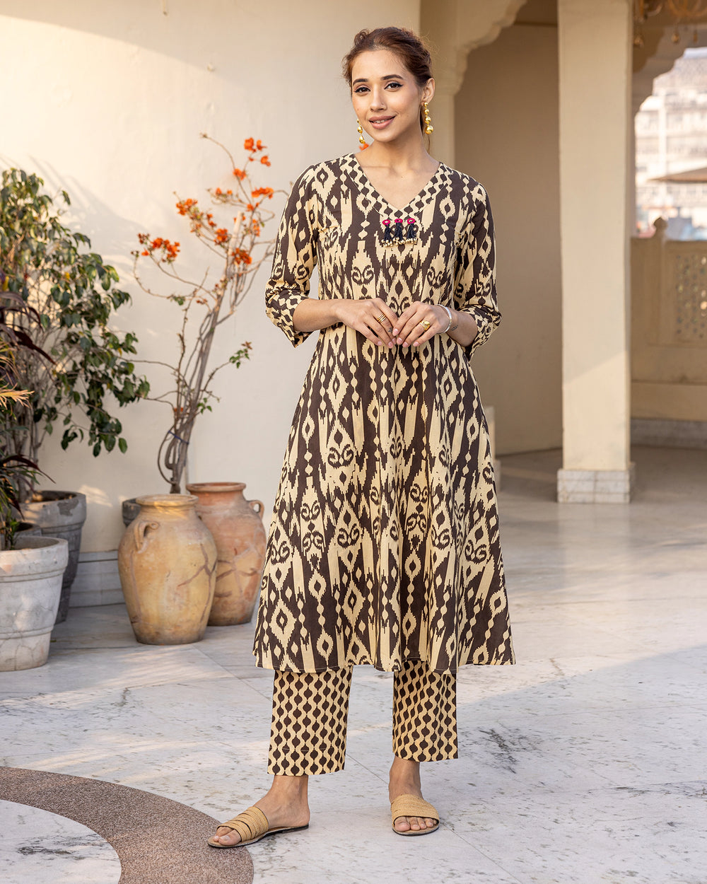 Serve a suave and oomph-worthy appeal in our breezy summer ensemble, accentuated with contemporary aesthetics and washed in a dopamine-inducing palette of brown. Our 2-piece assorted kurta set is crafted in a treasured weave of quality cotton and includes a round neck A-line kurta beaded with an Ikat print tale, and a pair of straight-fit bottoms.
