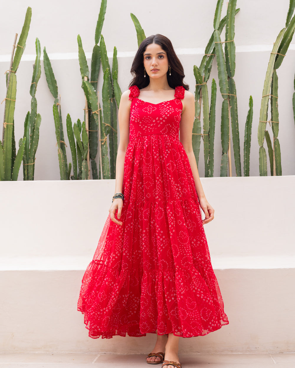 Breezy, and beautifully tiered — this red maxi dress features soft bandhani prints, delicate ruffled straps, and a flowy silhouette crafted in lightweight chiffon. Ideal for holiday getaways, or that perfect brunch-by-the-beach.