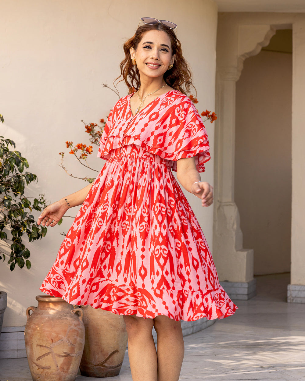 Serve a suave and oomph-worthy appeal in our breezy summer ensemble, accentuated with contemporary aesthetics and washed in a dopamine-inducing palette of red. Our 1-piece flared short dress is crafted in a luxe weave of rayon and is accentuated with a v-neck and an all-over Ikat print tale.