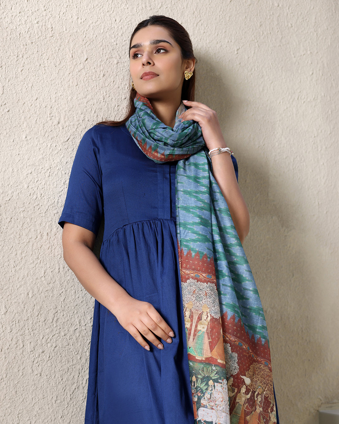 This navy A-line kurta set is crafted from breathable cotton, it’s designed to keep you comfortable throughout your busy workday. The printed dupatta adds a stylish flair that complements the rich navy tone, making it ideal for any professional setting.