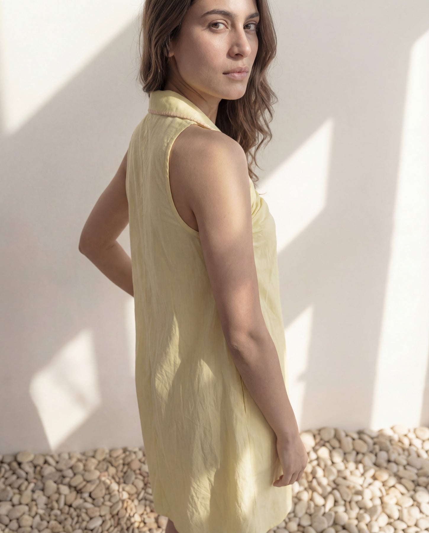 Bring modern versatility to your wardrobe with the Gather & Go Yellow Dress, designed for effortless everyday comfort. Crafted from a breathable blend of 70% linen and 30% cotton, this sleeveless dress features a cheerful yellow hue with a clean solid pattern. The flattering V-neckline and easy silhouette offer a relaxed yet stylish fit for all body types, making it perfect for daily wear.