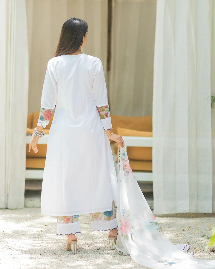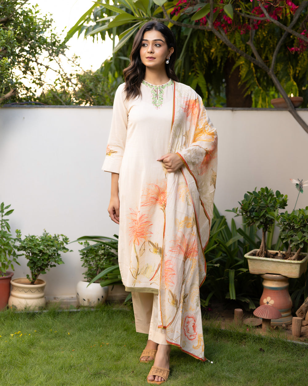 The Peach Bloom Suit set features a soft peach base with floral prints. Paired with straight pants for a clean silhouette, and the matching printed dupatta completes the ensemble.